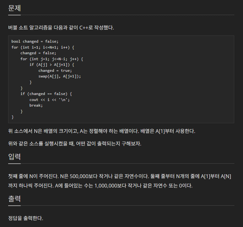 문제에서 주어진 코드는 버블 정렬이 끝났을 때 몇 번째 i 반복에서 끝났는가를 구하는 코드이다.